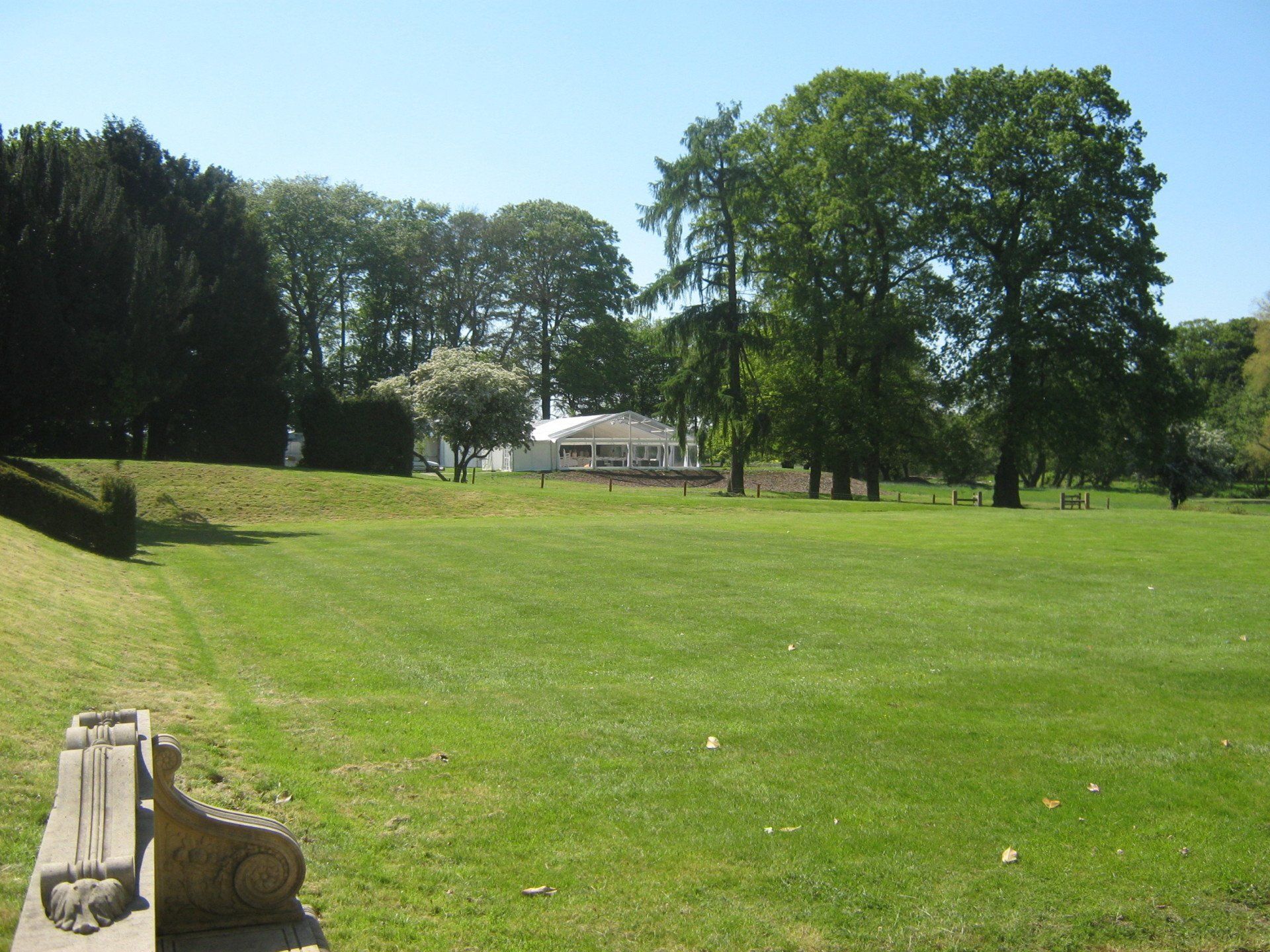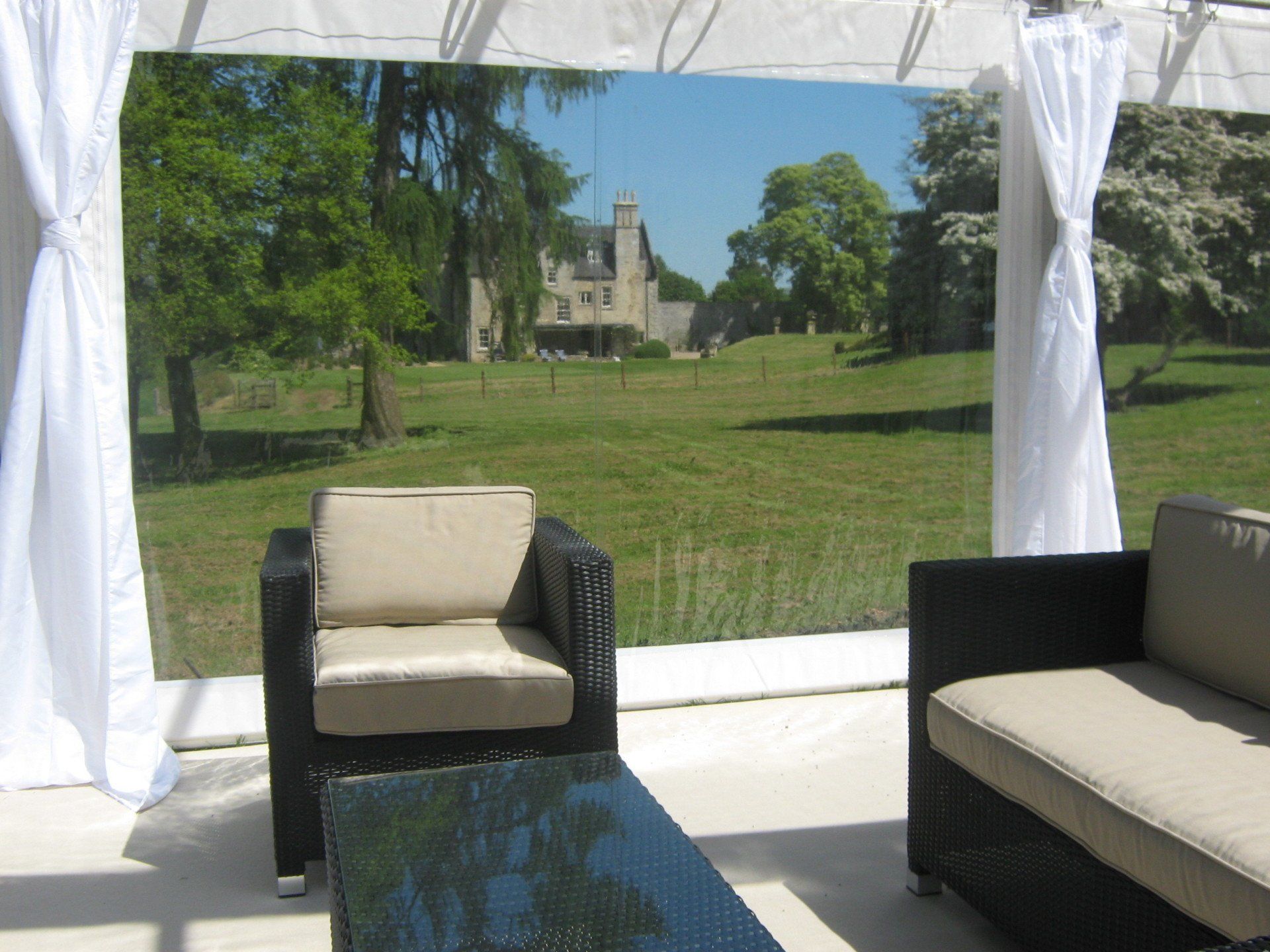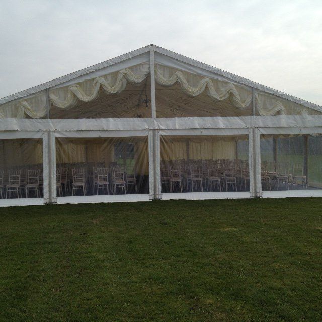 We were approched by a couple to provide a marquee and equipment for their upcoming wedding reception. The couple had exclusive use of a local private stately home and beautiful grounds. A site survey was arranged and the best position and layout of the marquee was decided. The couple wanted to make the most of the views of the grounds and across to the lake, so a clear gable end and clear roofs over the reception area with total clear windows down one side to get as much as the views as possible was agreed. The marquee was floored, carpeted with new one off cream carpet, lined over the dining area and LED star cloth ceilings installed over the entertainment section where a Jet Black Dance Floor and raised stage was put in for the band and DJ. We also installed a kitchen tent, power distribution and generator, furniture, as well as luxury toilet facilities in an enclosed cloakroom/make up area. These pictures were taken before and on the day of the wedding. The couple were delighted with the finished product