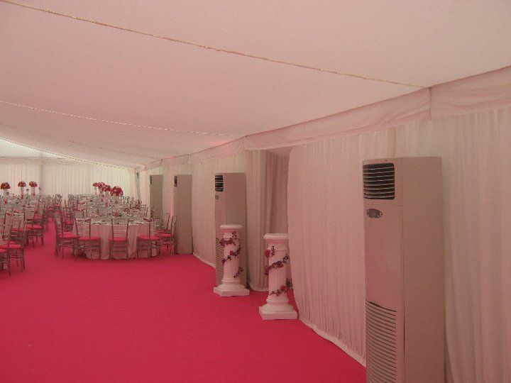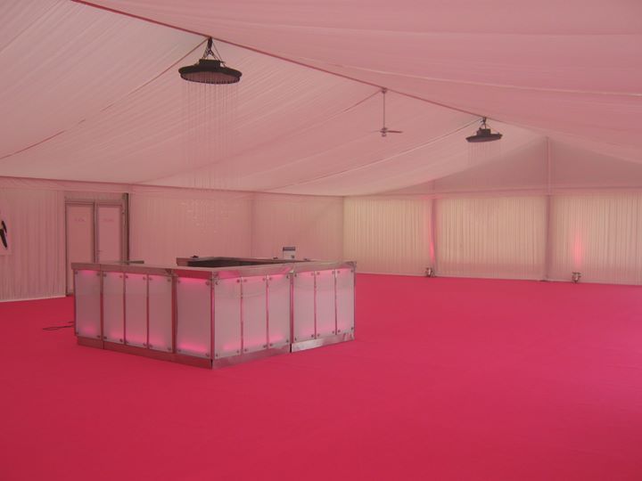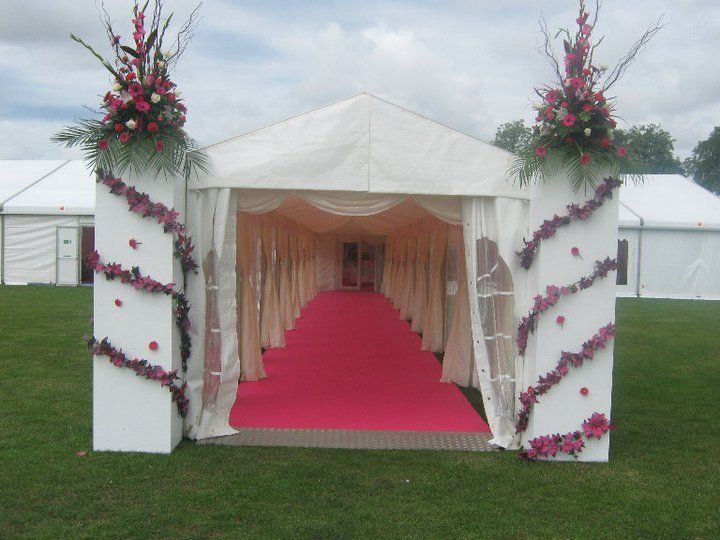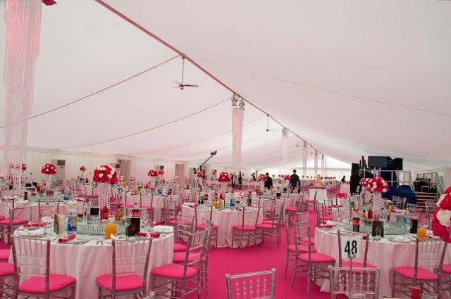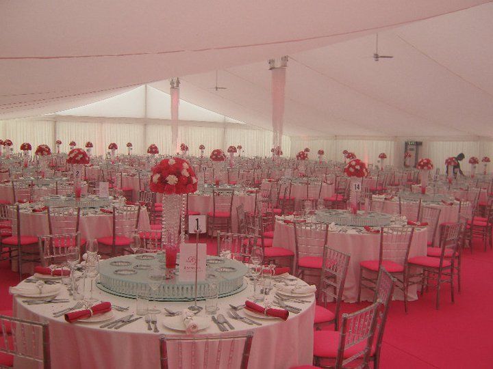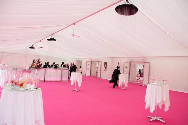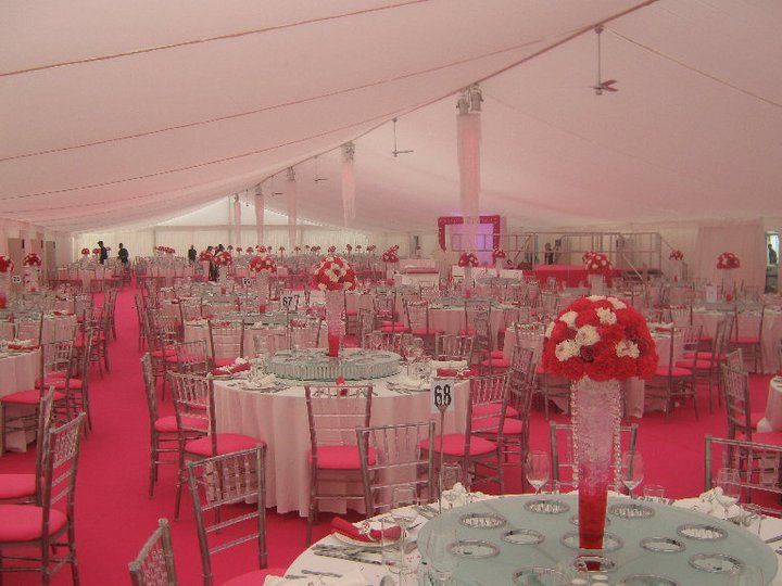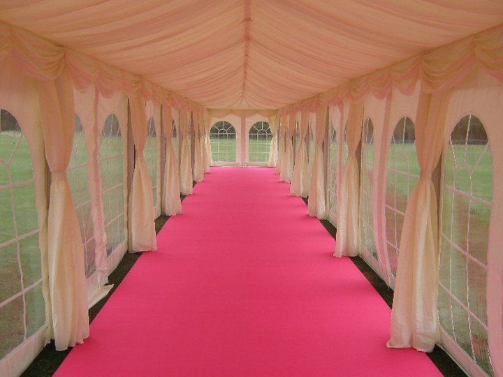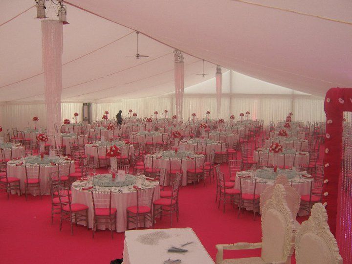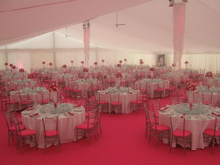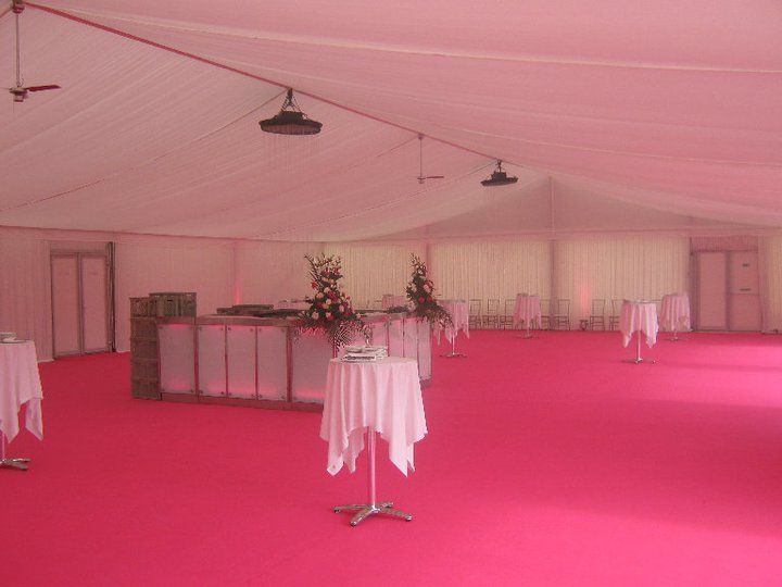 These pictures show you how a marquee can be a "blank canvass" for you to create whatever look you wish. This was for a wedding reception for 850 guests at a private stately home in Leicestershire. The bride's wish was for as much pink as possible and that's what we created for her. The pads on the chairs were made up especially for this job, to match the carpet and pink up lighting. The roof linings supplied were "flat white" which create a different feel to pleated .Walling was pleated with pink up lights. We provided a generator with enough power to light up a small village, with enough for the caterers, lighting systems, bar, air con units, toilets built inside the marquee, dance floor (white LED) We loved the finished look, it certainly was a wedding to be remembered