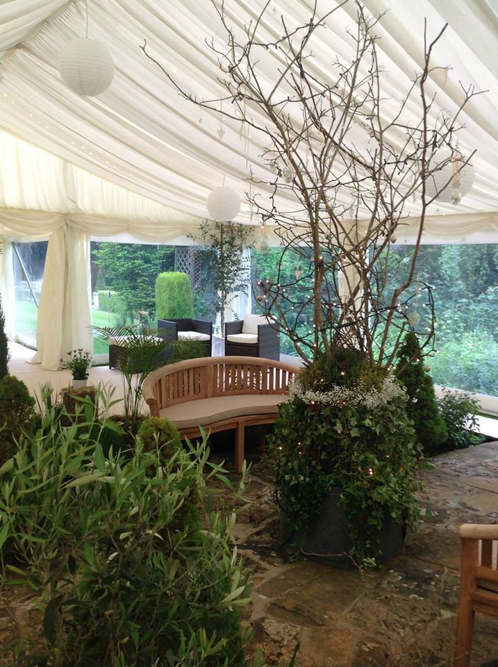 We were approached by a previous existing customer to cover the entire garden for his daughter's wedding reception. As the garden had lots of trees and flower beds in it proved to be a challenge. The marquee structure wrapped around the house in a L shape covering the three lawns and all joined together creating different space in each area, one for the bar area, one for a chill out area covering an existing patio and flower bed and one for the main dining area for 100 seated on straight tables. The structure was also fixed and attached to the house. The marquee was fitted with wooden floor throughout, new cream carpet, pleated linings with a fairy lighting canopy and white paper lanterns, lime wash Chiavari chairs and trestle tables, dance floor, bar units and chill out furniture. We also supplied luxury trailer toilet units and catering annexes.