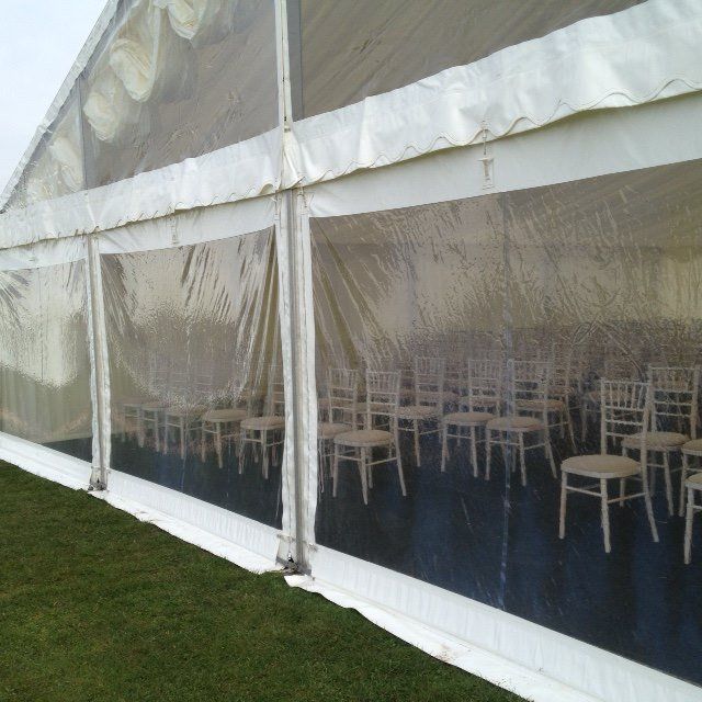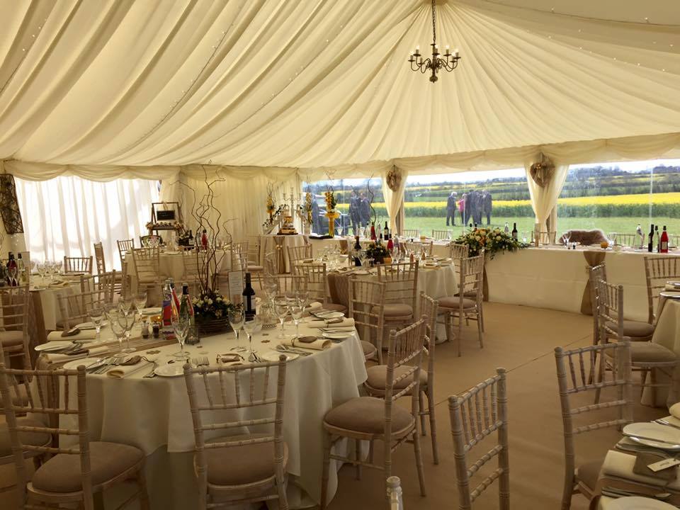 We were approached by a farmer to provide a marquee and fittings on his paddock to accommodate 100 guests for his daughter's wedding reception. As the marquee was on a farm they wanted a country/rustic feel. We provided the marquee with linings, flooring and new cream carpet, furniture, lime wash Chiavari chairs and total clear window sections to look out over the paddock. We also supplied heating, toilet facilities inside an attached cloakroom and make up area, kitchen area for the caterers and power distribution and a super silent generator.